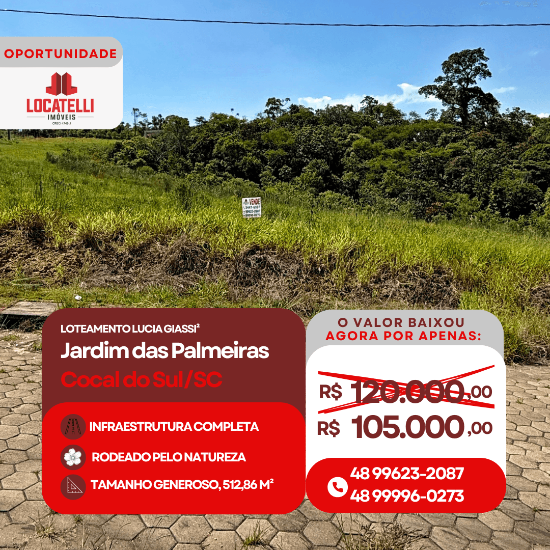 Este lote é a escolha ideal para quem não abre mão de viver com tranquilidade e em harmonia com a natureza. 📍Loteamento Lucia Giassi 2, Jardim das Palmeiras - Cocal do Sul/SC. ✅ R$ 120 mil com entrada + parcelamento direto em até 48x, sem juros, apenas correção pelo CUB. ✅ ótimo desconto à vista: apenas R$ 105.000,00.